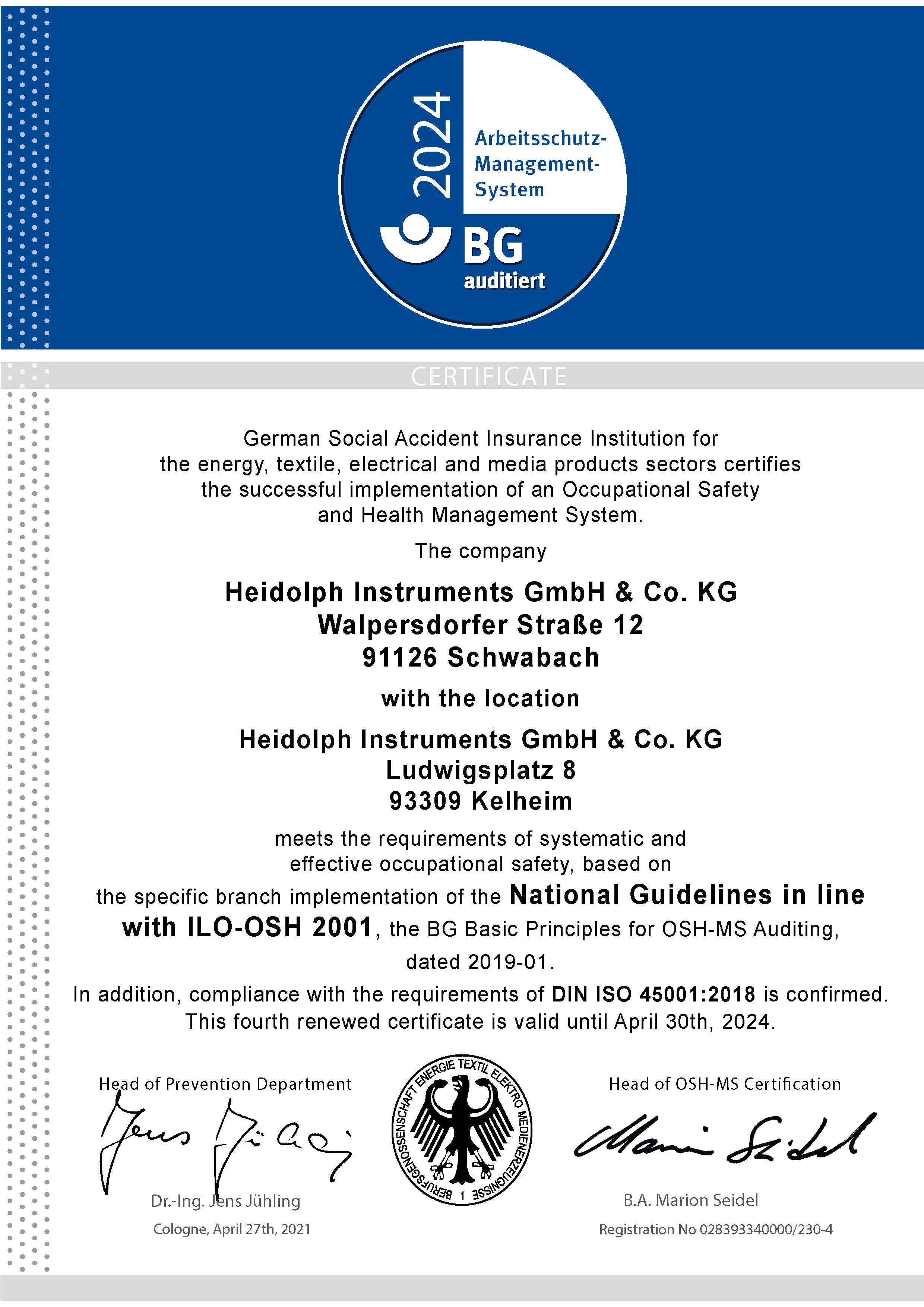We believe that we can ensure the long-term and comprehensive protection of our employees with only one system solution. With the Occupational Health and Safety Management System (AMS) of the BG ETEM, we are in the position for the third time in a row to have the implementation of these systematic preventive measures certified. Thus, our company Heidolph Instruments in Schwabach, as well as the branch in Kelheim, meet the requirements for a systematic and effective occupational safety based on the NLF / ILO-OSH 2001. Particularly mentionable is the practical relevance of the occupational health and safety at work rated. As a premium manufacturer, we can conscientiously fulfill our responsibilities without losing any of the agility and quality in the international market environment.
