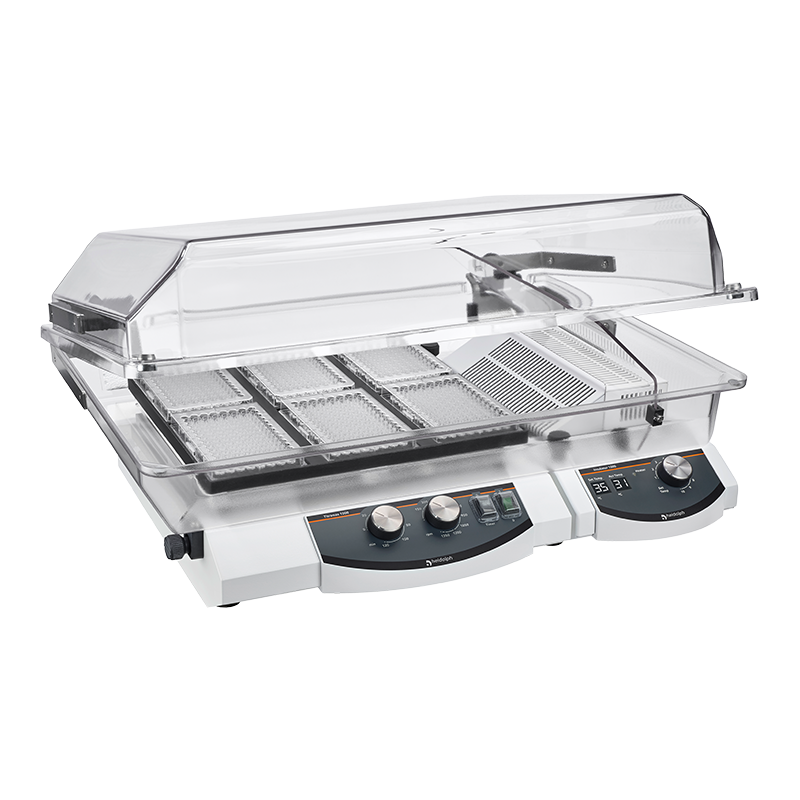Combine several of our platform shakers with a heating module and hood to create an incubator. The heating module gently warms the circulating air to up to 65° within non-fogging hood.